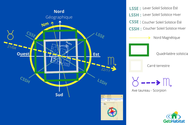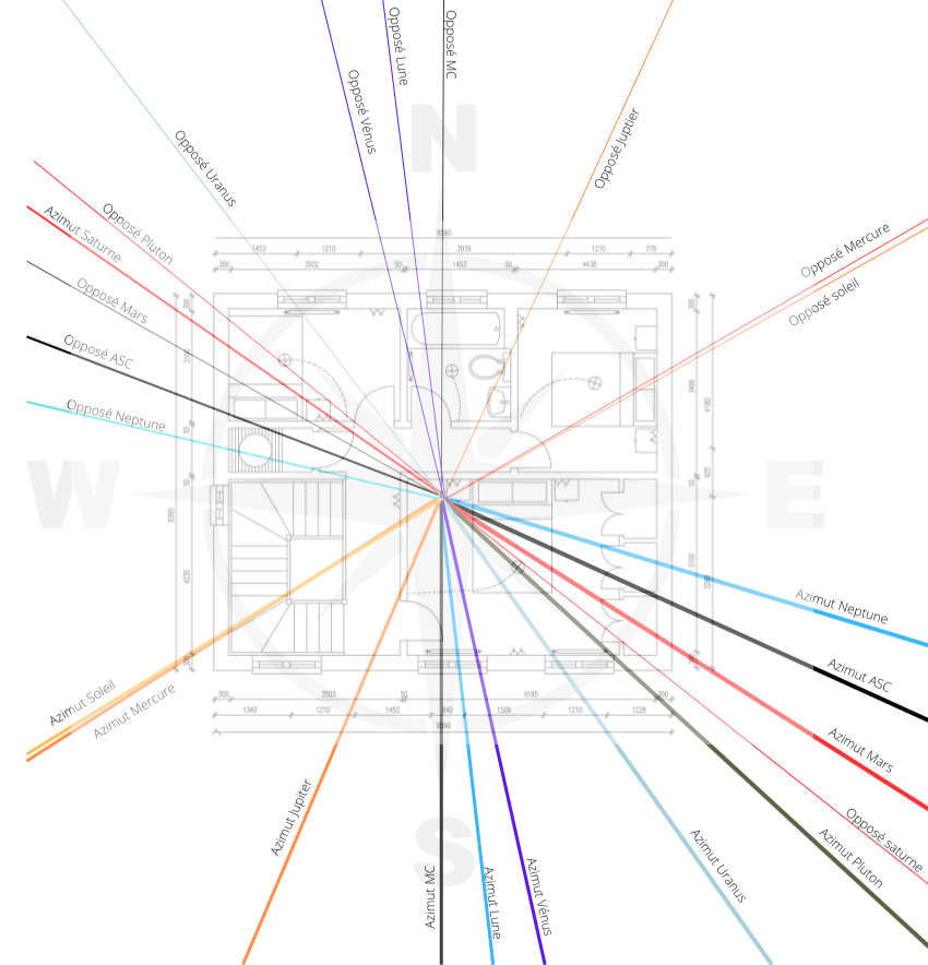 - Orientation suivant un axe planétaire de notre thème astrologique:: Suivant les solstices du lieu et les axes de notre thème astral (ascendant - descendant) ou (noeud Nord et sud) , on pourra décider comment aligner la maison.